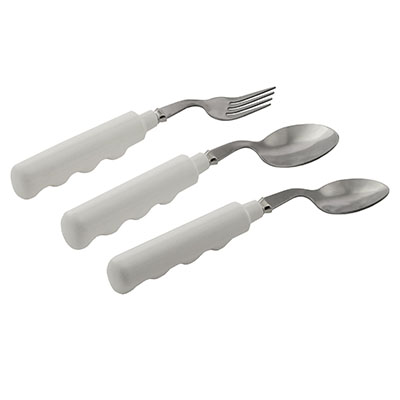 Cutlery with a grip designed to give independence at meal time. These utensils allow maximum user control with minimum effort. Useful in both institutions and at home. The comfort grip has a soft vinyl coating with finger indentations for a secure grip. Suited for persons with poor grasp with a 7/8" (22mm) diameter grip. Light weight, 85 grams (3oz) each. Dishwasher Safe. Latex Free.