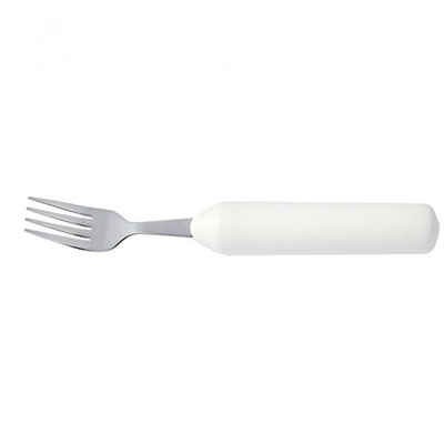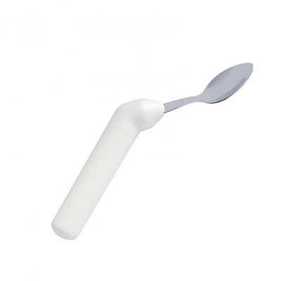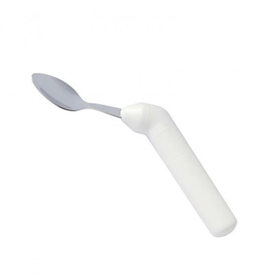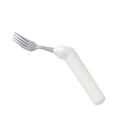 Featherlite line of cutlery is very light weight. The average weight is 48 grams (1.7oz). The handles are one inch in diameter and slightly tapered and textured for easy gripping. They are totally sealed to prevent water seepage and are dishwasher safe. The stainless steel utensils have been designed for use by persons with disabilities. The fork has short tines with rounded tips. The knife blade can be used as a rocker knife or as a regular knife. Spoon bowls are not too large. The angle of the left and right offset have been designed to minimize wrist movement. The Ergo utensils in this line compose a complete set of rocker knife, fork, teaspoon and soupspoon. The addition of this grip angle further enhances our ability to solve gripping problems at meal time.
