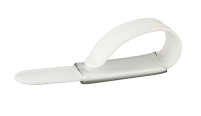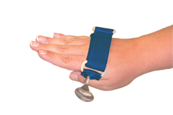 The utensil holder has a polypropylene webbing with a utensil pocket. It adjusts via a velcro hook and a loop closure with a D-Ring thumb loop. To find the right size, measure your hand across the top of the knuckles. This Large/X-Large size loop fits sizes 4.25" to 4.75".