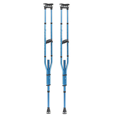 Lighter than wood, the standard underarm aluminum crutch provides stability and durability. Double extruded center tube provides additional strength to weight-bearing area. Push-pin adjustment makes it easy to adjust crutch height in 1" increments. Non-skid, jumbo size vinyl contoured tips provide excellent traction. Easy wing nut adjustments for hand grips. Youth crutches for user height 4'6" - 5'2". Weight capacity: 350 lb.