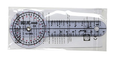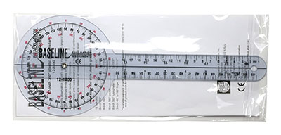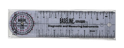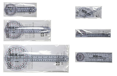 Baseline 6-Piece clear plastic goniometer kit includes 1 each 12", 8" and 6" 360 degree goniometers; 1 each pocket 180 degree goniometer, 360 degree rulongmeter and finger flexion/hyper-extension goniometer. Transparent plastic goniometer permits observation of joint's axis of motion, and its range of motion. The head has three scales calibrated to be used with the ISOM (International Standards of Measurement, STFR) system. Arm has a linear scale in inches and centimeters and remains at measurement position until reset. Angle scale reads 1 degree increments.