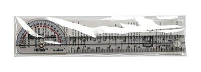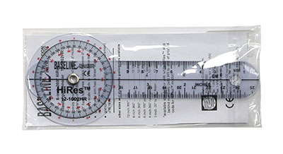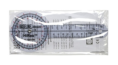 Baseline HiRes 6-Piece clear plastic goniometer kit includes 1 each 12", 8" and 6" 360 degree goniometers; 1 each pocket 180 degree goniometer, 360 degree rulongmeter and finger flexion/hyper-extension goniometer. The HiRes design ads a white line behind measurement gradations to make the readings easy to see. Transparent plastic goniometer permits observation of joint's axis of motion, and its range of motion. The head has three scales calibrated to be used with the ISOM (International Standards of Measurement, STFR) system. Arm has a linear scale in inches and centimeters and remains at measurement position until reset. Angle scale reads 1 degree increments.