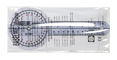 This transparent plastic goniometer permits observation of a joint's axis of motion and its range of motion. The primary purpose of this device is to assist in physical therapy by determining range of motion of a joint as well as evaluating and gauging recovery after surgery or physical therapy. The 360° head has three scales calibrated to be used with the ISOM (International Standards of Measurement, STFR) system. This is an essential tool for treatment, rehab and surgical recovery and evaluation. Given its convenient shape and size, this is suitable for home use as well as multi-user environments. The arms are 6". This goniometer lets you measure joint limits and range-of-motion as well as check extension, flexion, abduction, adduction and rotation. The arms have a linear scale in both inches and centimeters. They also will remain at the last measurement position until reset. The 360° angle scale reads 1° increments. The clear plastic of the goniometer allows the device to be placed directly and exactly on a joint or limb for easy observation. This Goniometer is a Baseline product, which means it's a trusted name in measurement and evaluation instruments. Baseline products have been used by Medical Professionals, Therapists, Doctors and Rehab Clinics all over the world since 1974. If you have ever received therapy after an injury, you have probably had your progress tested and measured with a Baseline measurement instrument.