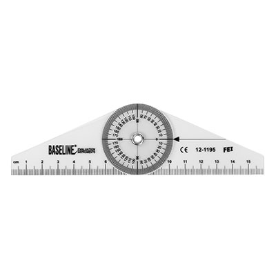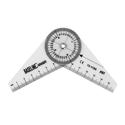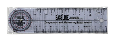 This transparent plastic goniometer permits observation of a joint's axis of motion and its range of motion. The unique design adds a white line behind the measurement gradations to make the readings even easier to read. The primary purpose of this device is to assist in physical therapy by determining range of motion of a joint as well as evaluating and gauging recovery after surgery or physical therapy. The 360? head has three scales calibrated to be used with the ISOM (International Standards of Measurement, STFR) system. This is an essential tool for treatment, rehab and surgical recovery and evaluation. Suitable for home use as well as multi-user environments. The arms are 12"". This goniometer lets you measure joint limits and range-of-motion as well as check extension, flexion, abduction, adduction and rotation. The arms have a linear scale in both inches and centimeters. They also will remain at the last measurement position until reset. The 360? angle scale reads 1? increments. The clear plastic of the goniometer allows the device to be placed directly and exactly on a joint or limb for easy observation. This Goniometer is a Baseline product, which means it's a trusted name in measurement and evaluation instruments. Baseline products have been used by Medical Professionals, Therapists, Doctors and Rehab Clinics all over the world since 1974. If you have ever received therapy after an injury, you have probably had your progress tested and measured with a Baseline measurement instrument.