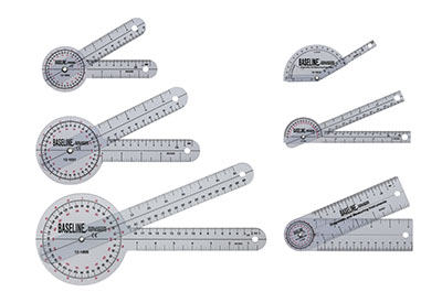 This is a 6-piece set of plastic goniometers that includes 1 each 12", 8" and 6" 360? goniometers; 1 each pocket 180? goniometer, 360? rulongmeter and finger flexion/hyper-extension goniometer. These transparent plastic goniometers permit observation of a joint's axis of motion and its range of motion. The primary purpose of these devices is to assist in physical therapy by determining range of motion of a joint as well as evaluating and gauging recovery after surgery or physical therapy. The heads have three scales calibrated to be used with the ISOM (International Standards of Measurement, STFR) system. These are essential tools for treatment, rehab and surgical recovery and evaluation. Suitable for home use as well as multi-user environments. These goniometers let you measure joint limits and range-of-motion as well as hyperextension through flexion. The arms have a linear scale in both inches and centimeters. They also will remain at the last measurement position until reset. The angle scale reads 1? increments. The clear plastic of the goniometer allows the device to be placed directly and exactly on a joint or limb for easy observation. These Goniometers are Baseline products, which means it's a trusted name in measurement and evaluation instruments. Baseline products have been used by Medical Professionals, Therapists, Doctors and Rehab Clinics all over the world since 1974. If you have ever received therapy after an injury, you have probably had your progress tested and measured with a Baseline measurement instrument.