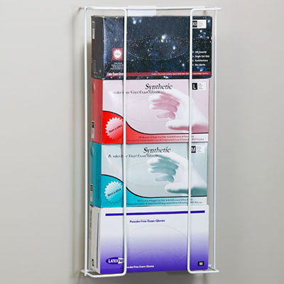 This Glove Box Holder is a facility standard. It holds three boxes of gloves either horizontally or vertically, depending on need and choice. Sturdy, durable and suitable for exam rooms, labs and every classroom and office in a medical facility. The white Glove Box Holder is constructed of powder-coated steel and will match nearly every decor. The design of the unit enables clear, quick, unimpeded access to glove box openings. Sized at 15.875" x 3.75" x 10", it holds standard boxes of gloves. Please note, this is the Glove Box Holder only. Gloves available separately. All the hardware to easily mount the Glove Box Holder is included. The unique, open design allows users to quickly identify gloves. The Glove Box Holder is Latex-free. Easy to clean using a soft cloth with warm water and mild soap.