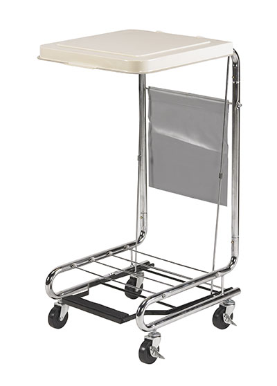 This hamper stand by Drive Medical features a white, poly-coated 18" x 19" steel lid that can be raised or lowered easily by a non-slip pedal. The hamper supports 36 to 42-gallon bags and glides easily thanks to 3" locking casters. The chrome-plated steel frame is attractive and simple to maintain.