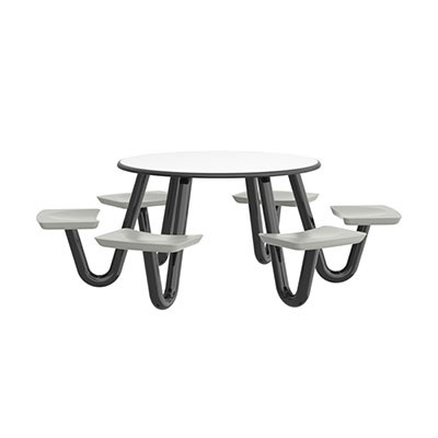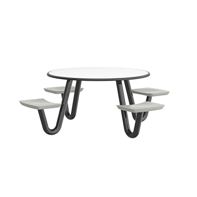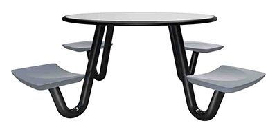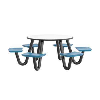 The Anchor Table is the perfect choice for any environment. Constructed of high impact "no break" polyethylene and designed with a rotationally molded design for increased strength, this durable product is perfect for any residential institution, school or university, detention center, public safety facility and more. The seat configurations range from 3 to 8 seats and are available in blue grey. The heavy-duty table is designed with a laminate top that is seamless one-piece design with extreme surface strength, high impact resistance, along with a rounded edge for additional safety and comfort. Attached to the legs are tamper-resistant screws for increased security and easy maintenance. The tables also feature a continuous seam welded frame structure that consists of 3" diameter 14-gauge powder coated steel with 11-gauge steel seat supports. ADA Compliant tables are manufactured with one less leg to meet building code requirements. Each table is proudly made in the USA! Floor bolting is recommended for added stability. This table is round with a 42" diameter and can seat up to 4 people.