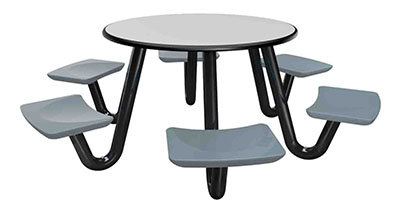 The Anchor Table is the perfect choice for any environment. Constructed of high impact "no break" polyethylene and designed with a rotationally molded design for increased strength, this durable product is perfect for any residential institution, school or university, detention center, public safety facility and more. The seat configurations range from 3 to 8 seats and are available in blue grey. The heavy-duty table is designed with a laminate top that is seamless one-piece design with extreme surface strength, high impact resistance, along with a rounded edge for additional safety and comfort. Attached to the legs are tamper-resistant screws for increased security and easy maintenance. The tables also feature a continuous seam welded frame structure that consists of 3" diameter 14-gauge powder coated steel with 11-gauge steel seat supports. ADA Compliant tables are manufactured with one less leg to meet building code requirements. Each table is proudly made in the USA! Floor bolting is recommended for added stability. This table is round with a 48" diameter and can seat up to 6 people.