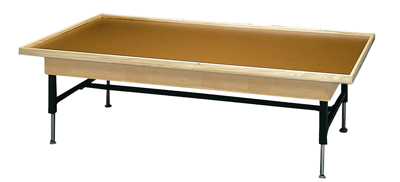 wooden platform table - manual hi-low, raised-rim, 7' x 4' x (19" - 27"):