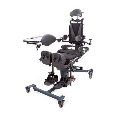 Modular design makes the EasyStand Evolv the most versatile standing frame available. The Evolv is a modular "sit to stand" stander with over 60 support and positioning components. The base unit is functional for many users, however when more support is needed a wide variety of positioning components can be added to accommodate the most involved users. Fits individuals 4'-5'6" tall and up to 200 lbs. The seat depth range (from seat pivot) is 14″-19″ and the seat height is 21.5". The upholstery is black and the frame comes in charcoal. The unit weighs 101 lbs. The maximum support package includes(no substitutions): Easy-Adjust Seat Depth, Front Swivel Casters for Swing-Away Front, SwingAway Front for Shadow Tray, Adjustable/Removable Actuator Handle, Shadow Tray, Large Contoured Chest Pad,Secure Foot Straps, Hip Supports, Independent Knee Pads for Swing-Away, Removable Contoured Back, Velcro Positioning Belt, Accessories Mounting Bracket, Chest Vest, High Mount Chest Vest Bracket, Lateral Supports, Planar Seat, Head Support, Multi-Adjustable Foot Plates, 5" Rear Locking Casters.