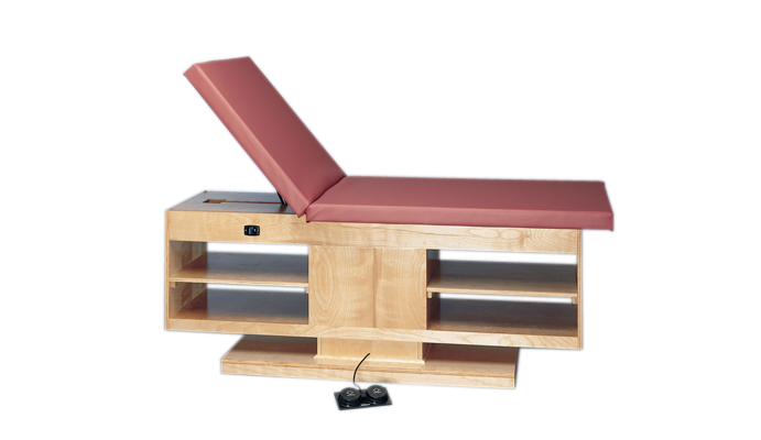 Electric hi-low 2-section treatment table with adjustable back. Ships completely assembled and ready to use. The vertical electro-mechanical drive offers a smooth and quiet operation. A full size table of solid wood. Includes: shelves, top size 30" x 78" x 2"; adjusts from 27" to 39" high; foot control; 110V 60Hz 6.5AMP 720 WATT; thermal overload protection; UL hospital grade plug and power cord 120" long. 300 lb. weight capacity. Seamless cushion and wood finishes available in various color options.