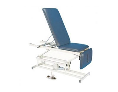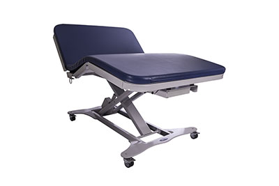 The Tri W-G Motorized Hi-Lo Treatment Table with Raised Back is the result when patient care is put to the forefront of innovative design and state-of-the-art engineering, with a dash of convenience added as well. This is a premium table that is noticeably different. The table has a weight capacity of 500 lbs. Construction is sturdy, with a steel top and a 12-gauge steel frame. Measuring a generous 28" W x 80" L, the table can raise or lower within a height range of 23.25" – 34.75". The back also raises and lowers via motor. Table also includes a generously sized built-in storage area. Perfect for spare towels and other supplies. The table is height adjusted through the motorized hand control and the base is secured with four corner stability. The 2" upholstered mat is available in 13 colors including imperial blue, blue ridge, burgundy, camel, dove grey, forest, graphite, grotto, black, mauve, sand, wedgewood and regimental blue and cleans easily with just water and a mild detergent. The steel frame comes standard with a Pearl Gray finish. Available accessories, sold separately, include a paper holder, siderails and casters.