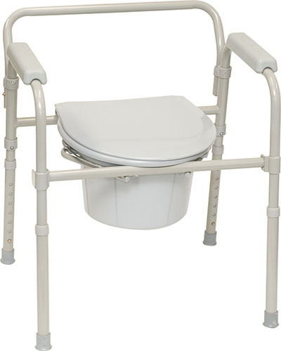 Easily opens and folds. Folds flat for convenient storage and transportation. Durable plastic snap on seat and lid. Powder coated steel construction is lightweight and durable. Removable tool free back. Padded arms for added comfort. Comes complete with 7.5 qt. commode bucket with handle, cover and splash shield. 16 - 22" height. 350 lb. weight capacity.