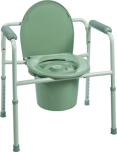 Using the bathroom shouldn't be a difficult chore. If reduced mobility makes getting to the bathroom a challenge, a home care commode can be a necessity. The Folding Steel Commode from Drive Medical can be easily setup in any room of the house for ultimate convenience. In addition, it can be used without the bucket and placed over an existing toilet as a secure, raised toilet seat for those who have difficulty bending to sit on a standard toilet. The Folding Steel Commode also makes a great toilet frame offering assistance when sitting on, or standing up from, the toilet. The durable, easy-to-clean unit features simple snap-button assembly that allows the commode to be disassembled for storage or transport. Easy push button height adjustment places the seat at the ideal level for you. The 7.5 quart commode bucket includes a convenient carrying handle, a cover and a splash shield. The commode also features plastic armrests for extra comfort and superior grip.