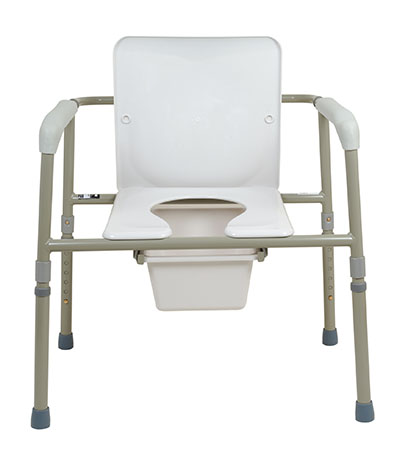 The Three-in-One Bariatric Commode helps assist you with your chronic or temporary medical mobility challenges. This versatile commode can be used as a toilet safety frame, a commode, and a raised toilet seat all in one. It can act as a free-standing commode with its angled legs for stability or function as a raised toilet seat with its plastic armrests which provide added comfort. It features a comfortable full-size seat with a removable bucket so that the commode can act like a toilet safety frame. The Bariatric Commode is ideal for larger patients because it has a wider seat and steel frame to support a higher weight capacity of 450 lbs. The durable, reinforced steel-welded frame comes in an attractive gray color can be cleaned with a little soap and water. The rectangular pan and pan cover are accessible from both the front and back of commode. Also included is a commode bucket and lid.