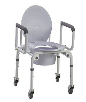 Steel Drop-Arm Wheeled Commode with Padded Arms. Easy-to-release arm mechanism allows for safe lateral patient transfers to and from commode. Arm provides additional support while transferring. Rust resistant, swivel casters (2 with locks). White powder coated steel frame is attractive and easy to maintain. Padded arm rests provide extra comfort and support. Comes with 7.5 qt. commode bucket with carry handle and splash shield. 18-24". 300 lb. capacity.