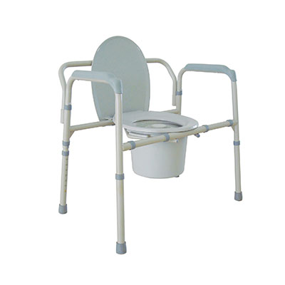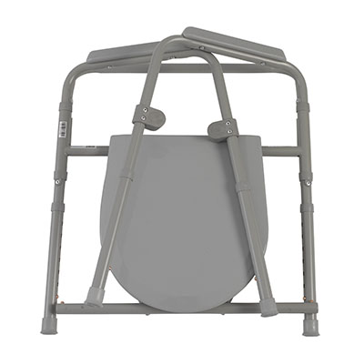 Easily opens and folds. Folds flat for convenient storage and transportation. Durable plastic snap on seat and lid. Assembles without pushing buttons. Grey powder coated steel welded construction increases strength and durability. Removable, tool free back. Plastic arms for added comfort. Comes complete with 12 qt. commode bucket with carry handle, cover and splash shield. Height adjusts from 16.5 - 22.5". Weight capacity is 350 lb.