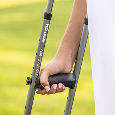 Lighter than wood, this walking crutch by Drive Medical provides stability and durability. Each crutch is manufactured with a double extruded center tube to ensure additional strength on weight-bearing areas. Extra thick (latex free) underarm pads and hand grips provide maximum comfort when in use. Tool free push-button adjustment allows the height of the underarm pad to be easily adjusted in 1" increments. Hand grips adjust separately without tools to ensure a proper fit.