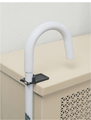 Small plastic fitting mounts on cane to hold it on a table edge when not in use. Best when used in pairs to contact both bottom and top of table. Small rubber band (included) placed around holder end maintains a secure grip on cane shaft.
