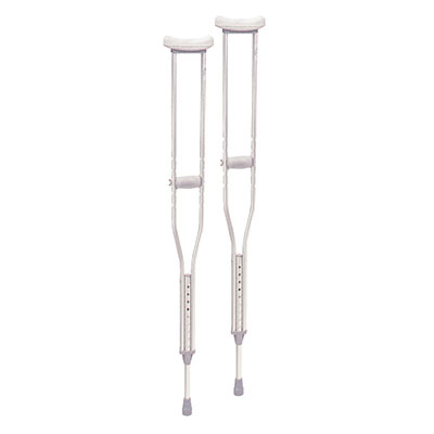 Lighter than wood, the standard underarm aluminum crutch provides stability and durability. Double extruded center tube provides additional strength to weight-bearing area. Push-pin adjustment makes it easy to adjust crutch height in 1" increments. Non-skid, jumbo size vinyl contoured tips provide excellent traction. Easy wing nut adjustments for hand grips. Pediatric crutches for user height 4' 0" - 4' 6". Weight capacity: 250 lb.