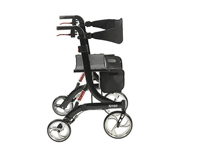 The Nitro Euro Style Walker Rollator is a safe and convenient aid for improving your daily mobility. The wheels make the Rollator a superior option over a standard walker, eliminating the need to lift the device and allowing you to walk with an easy, smooth gait. The unique suspension system allows for easier traveling over uneven, outdoor terrain, making them great for your active, busy lifestyle. With a wider built-in seat found on the Rollator, you'll always have a convenient place to rest. Featuring an eye-catching style, the Nitro's caster fork design allows for an enhanced turning radius while the 10" front casters allow for optimal steering and rolling comfort. In addition, the Nitro locates brake cables within the unit's black frame for safety and offers a quick and easy tool-free adjustment to the handle height and back support. The Nitro provides easy mobility for users up to 450 lbs. and easily folds with one hand to an ultra-compact size for storage.