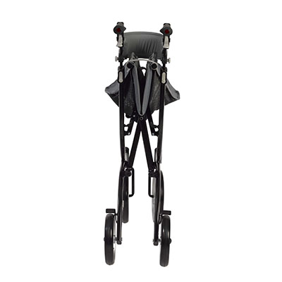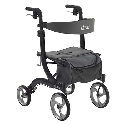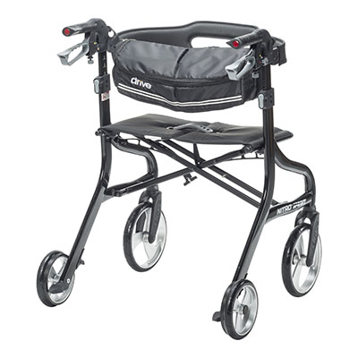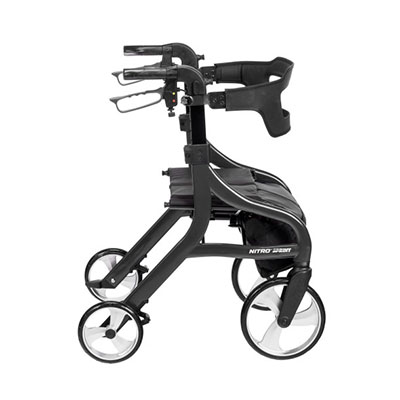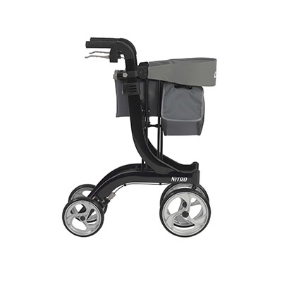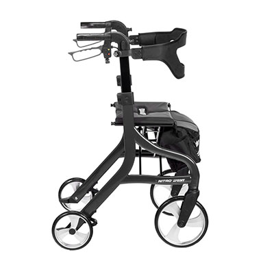 The sleek Nitro Sprint Rollator is designed to provide comfort, convenience, and control at every turn. The rollator sports a unique braking system that reduces tire wear and an integrated slow-down brake for safer maneuverability over diverse terrain. When not in use, the rollator can be folded side to side with one hand and locked in place for easy transport. Other features include multiple storage bag mounting points and a wider backrest with a window for improved comfort and visibility. Contoured backstrap with viewing window for improved comfort and visibility. The patented frame design provides added strength and durability with a 350lb weight capacity. The seat is 18 inches wide. Integrated slow-down brake controls speed when navigating diverse terrain. The enhanced braking system reduces tire wear and allows for easy replacement of brake pads and cables. Improved tire tread for better stopping ability. Built-in accessory mount easily attaches a cup, cane or smartphone holder. Built-in brake cable for improved durability and safety. Large 10" front wheels provide optimal stability and rolling comfort. Large 10" front wheels provide optimal stability and rolling comfort. Folds side to side with one hand and remains locked for easy transport and storage. A padded seat provides added comfort while sitting. Storage bag mounts in multiple locations for easy access. Comes black in color.
