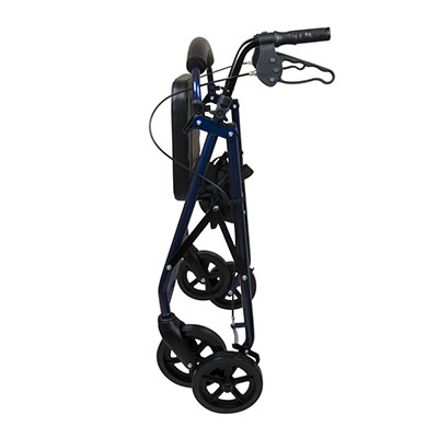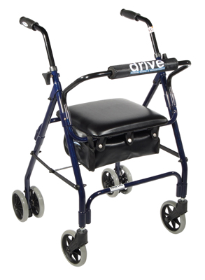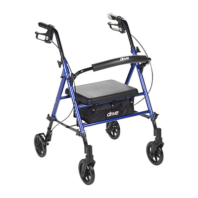 The Drive Adjustable Height Rollator in Blue is the ultimate accessory to assist independent mobility. With a 300 lb. weight capacity and 6" offset wheels, this rollator is ready and sturdy for indoor movements and outdoor travelling, regardless of terrain. This unit is personalized by the user with height adjustments possible in two locations - seat height and handle height. The seat can be adjusted from 18" to 24". The height of the handles can be adjusted as well, from 29.5" to 38", ensuring each use of this rollator is a customized experience. This rollator comes with seamless padded seat which, underneath includes a zippered pouch for added privacy and security of personal items such as oxygen tanks, or other necessities. With movement comes stopping, and the brakes on this rollator are top-notch. They feature serrated edges to provide a firm hold once stopped and they stay locked with the aid of easy-to-use, deluxe loop locks. The seat on the rollator is designed for function and comfort, which is why it includes a hinged, padded backrest that can be folded up, down or removed completely. The handles, which provide easy access to the loop locks, are ergonomic, easy-to-grip and help relieve hand pressure. Additionally, the knobs are ergonomic too and are self-threading. Taking the rollator on the go is a breeze. It's quite portable at only 14 lbs. and features folding hinges, which lets the rollator fold up quickly. At only 24" wide and with four wheels that swivel, this unit is compact and maneuverable in even the tightest rooms and hallways.