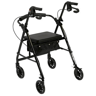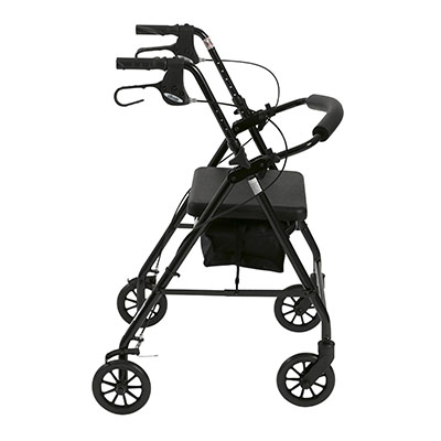 The ProBasics Deluxe Aluminum Rollator has large 8-inch wheels for improved maneuverability and is ideal for outdoor terrain. The added seat and removable padded backrest provide a comfortable resting area. It features easy-to-operate ergonomic hand brakes, a water-resistant nylon pouch, and a built-in fold strap for easy storage and transport. Supports patient weights up to 300 pounds.