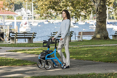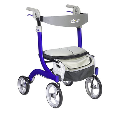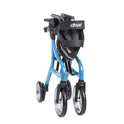The Drive Elevate Upright Walker brings users increased balance and stability while promoting better posture and providing a more natural line of sight than traditional mobility aids. Height-adjustable upholstered forearm pads keep arms supported and level for comfortable use, while large, ten-inch wheels make it perfect for indoor and outdoor use. With a one-handed, side-to-side fold, the Elevate Upright Walker is the stand-up mobility aid that's easy to take on the go. Padded armrests and upright handle adjust to user height preferences. Durable and comfortable padded seat. Simple one-handed, side-to-side folding. Includes removable zipper storage bag with strap. Dual front fork for optimal stability and maneuverability. Loop lock brakes for added safety and control. Adjustable length dual handbrake system. Large 10" multi-terrain front wheels for indoor and outdoor use. Height adjustable backrest. Comes blue in color.
