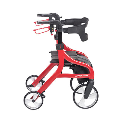 The sleek Nitro Sprint Rollator is designed to provide comfort, convenience, and control at every turn. The rollator sports a unique braking system that reduces tire wear and an integrated slow-down brake for safer maneuverability over diverse terrain. When not in use, the rollator can be folded side to side with one hand and locked in place for easy transport. Other features include multiple storage bag mounting points and a wider backrest with a window for improved comfort and visibility. Contoured backstrap with viewing window for improved comfort and visibility. The patented frame design provides added strength and durability with a 350lb weight capacity. The seat is 18 inches wide. Integrated slow-down brake controls speed when navigating diverse terrain. The enhanced braking system reduces tire wear and allows for easy replacement of brake pads and cables. Improved tire tread for better stopping ability. Built-in accessory mount easily attaches a cup, cane or smartphone holder. Built-in brake cable for improved durability and safety. Large 10" front wheels provide optimal stability and rolling comfort. Large 10" front wheels provide optimal stability and rolling comfort. Folds side to side with one hand and remains locked for easy transport and storage. A padded seat provides added comfort while sitting. Storage bag mounts in multiple locations for easy access. Comes red in color.
