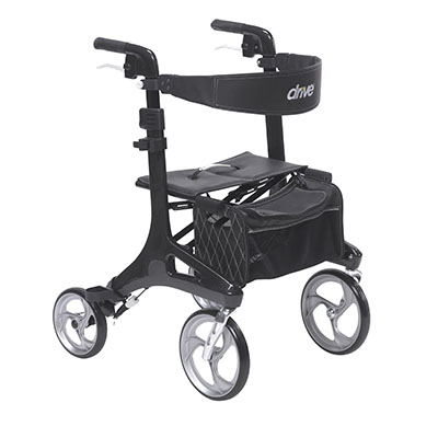 The sleek Nitro Sprint Rollator is designed to provide comfort, convenience, and control at every turn. The rollator sports a unique braking system that reduces tire wear and has an integrated slow-down brake for safer maneuverability over diverse terrain. The enhanced braking system reduces tire wear and allows for easy replacement of brake pads and cables. Large 10 inch front wheels provide optimal stability and rolling comfort. Improved tire tread for better stopping ability and built-in brake cable for improved durability and safety. The patented frame design provides added strength and durability with a 350lb weight capacity. Contoured backstrap with viewing window for improved comfort and visibility. Built-in accessory mount easily attaches a cup, cane or smartphone holder. A padded seat provides added comfort while sitting. When not in use, the rollator can be folded side to side with one hand and locked in place for easy transport. Other features include multiple storage bag mounting points and a wider backrest with a window for improved comfort and visibility. Tall seat to floor height is 23 inches and handle height is 32 to 39.4 inches.