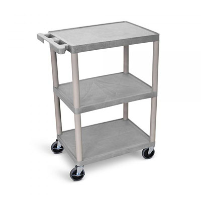 Ideal for an array of applications, this multipurpose utility cart is just what you need in a serving or storage cart. It can handle tough, heavy cargo up to 300 lbs. since its shelves and legs are made from strong, molded thermoplastic resin that won't scratch, stain, dent or rust. This 3-shelf cart offers a generous clearance of 11.75" between each shelf provides ample room for various items. There's even a .25" retaining lip on each shelf to keep items from sliding off. With rolling 4" casters and an ergonomic push handle molded into the top shelf, you have secure control of the cart while moving it. The grey color offers a professional look suitable for any office, healthcare, or educational environment. Comes ready-to-assemble with clear instructions for quick setup. Proudly made in the USA!