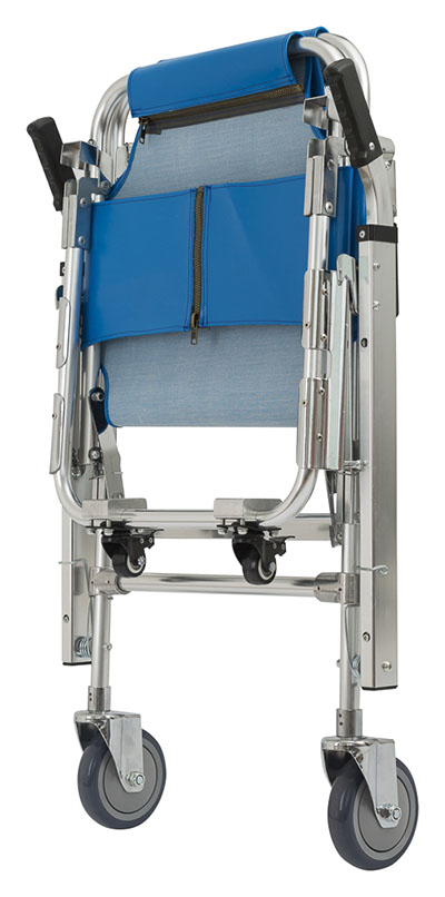 The 4-wheel standard medical emergency evacuation stair chair was designed with extra 2 front heavy-duty wheels to assist with transporting individuals easier, faster and safer. The standard 4-inch rear wheels, front extending support handles, rear folding heavy duty support grip handles and three webbing restraint straps, will provide added safety and stability. It comes with a heavy-duty blue vinyl protective cover that is durable and easy to clean. It features 3 heavy duty quick release restraint straps to secure individuals during transport or while moving the patient up or down stairs. Measures 36 x 21 x 28 inches and has a weight capacity of 400 pounds.