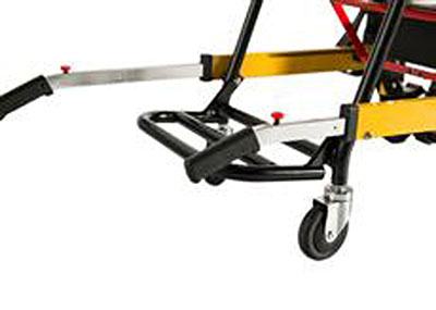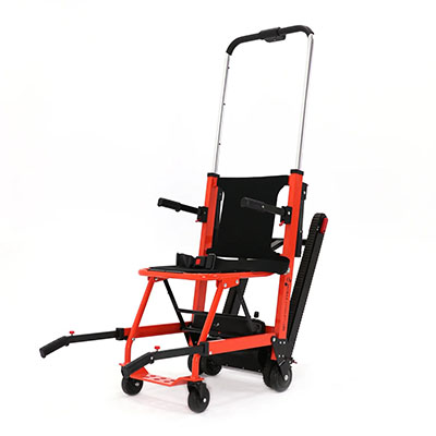 The Battery Powered Red Lift Track Stair Chair has a power track system that makes transporting patients up and down stairs an easy task. The power track system provides controlled transportation up and down stairs. Height: 41" to 62". Width: 24". Length: 31.5". Weight: 70 lbs. Turning Radius 47.24". Max load capacity: 440 lbs. Maximum stair pitch 45 degrees. Battery Powered Track Stair Chair. 24 Volt Battery. Battery Charger. 2500 Stairs on a Full Charge. Tubular Frame Construction, Increased Frame Strength. Folded Size: 41" x 21" x 11". Height Adjustment: 41" to 62". Adjustable Head Support. 3 Position Track Angle. Molded Hand Grips. Sturdy Seat Restraint. 10" Solid Rear Wheels for Increased Stability. 5" Front Swivel Wheel. Improved Heavy Duty Front Castor Assembly. Rear Wheel Hand and Foot Brake Lever. Larger Heavy Duty Front Foot Rest. Detachable Seat and Back Cushion. Easy Set-up. Folds Compactly for Storage. Bright Red for High Visibility.