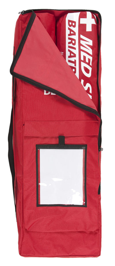 Front pocket with visible pouch for equipment instructions, wall hooks for vertical or horizontal installation, accommodates 2 Bariatric 48" Adult Med Sleds.