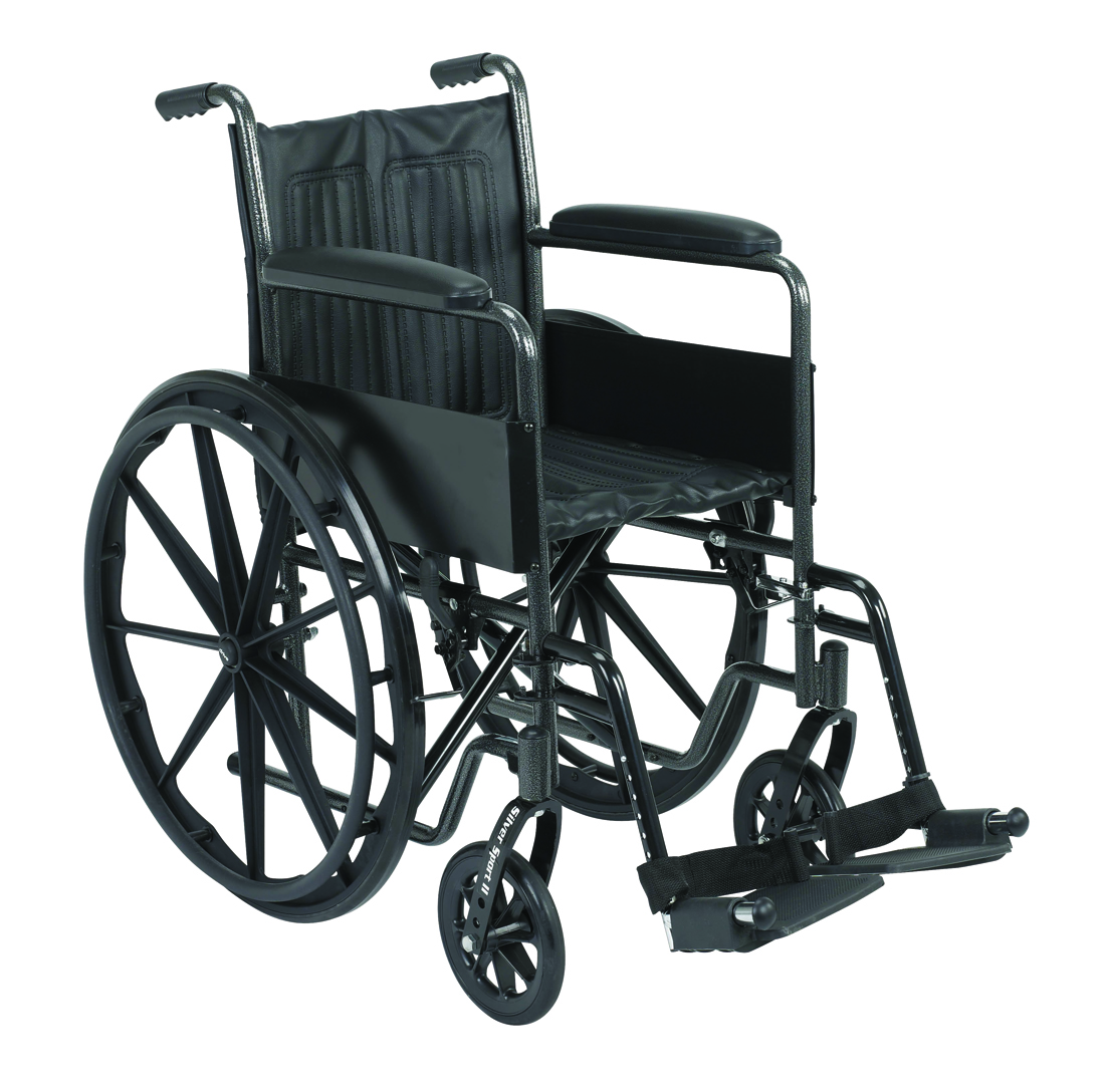 Powder coated steel frame is lightweight, strong and durable. The wheelchair comes with padded armrests and plastic footplates. The vinyl upholstery is durable, and easy to clean. There are urethane tires on the composite wheel; push to lock brakes. There are 8" front casters which are adjustable in 3 positions. The chair comes with a carry pocket on the backrest providing additional convenience. There are swing-away footrests or swing-away elevating leg rests with adjustable length riggings. The weight capacity is 250 lbs. Available with several arm and foot options.