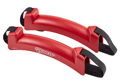 The Shield is a wheelchair barrier that is molded from anti-microbial thermoplastic polyurethane for comfort and cleanliness. It protects wheelchair users and riders from having to come in contact with the contaminated wheels, thus preventing the transfer of any germs, bacteria, or infectious disease. The Sheild Wheelchair Barrier features adjustable elastic straps that attach to the front and back of most standard wheelchairs. Included are a set of 2 Shield Wheelchair barriers that are both red in color.