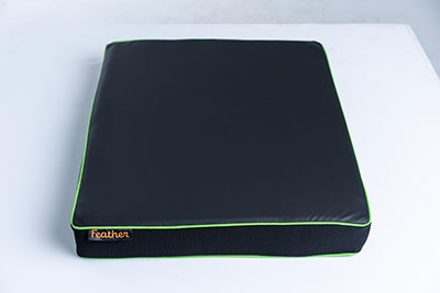 Experience the perfect blend of comfort and elegance with the Feather Cushion. Designed with both aesthetics and functionality in mind, this cushion is a must-have for wheelchair users who refuse to compromise on either. Crafted with medium-high density foam, the Feather Cushion provides unparalleled support and coziness, ensuring that you stay comfortable even during extended periods of sitting. Equipped with a water-resistant cover that is also breathable, it ensures a dry and pleasant experience, no matter the weather conditions. The non-slip bottom keeps the cushion securely in place, granting peace of mind even during movement-filled days. A sturdy carry handle makes the cushion easy to transport for hassle-free use. Available in three piping colors, these cushions are designed to beautifully coordinate with the full range of Feather wheelchairs, adding a personalized touch to your ride. The 22" Green Feather Cushion is 2" thick and includes a top layer of memory foam that is 3" thick. It is a great addition to the Feather HD Chair, or any brand for that matter. The Feather Cushion isn't just an accessory; it's an upgrade to your daily life. With its premium build and thoughtful design, you can now enjoy day-long comfort, enhanced mobility, and a pop of personalized color that reflects your unique style. With the Feather Cushion you can make life more comfortable.