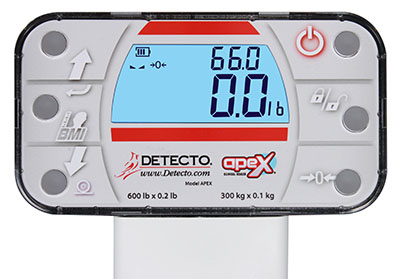 Detecto's apex eye-level digital physician scales feature inline mechanical height rods and an extra-wide, flat platform measuring 17 in W x 17 in D x 2.75 in H. The apex scale features 600 lb x 0.2 lb / 300 kg x 0.1 kg capacity, 0.75-inch-high clinical-blue LCD weight readouts, units locking into kilograms or pounds, BMI calculation, AC or battery power (AC adapter included on some models), 1 RS232 serial port and 1 micro USB-B port, HL7 IEEE 11073 compliance, Wi-Fi/Bluetooth and Welch Allyn connectivity, dual wheels for transport, sturdy column construction, and integral bubble level.