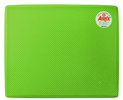 The Airex Elite Balance Pad is a foam stability exercise trainer that's terrific for balance, stretching, physical therapy, mobility, rehabilitation and core strength training. Lightweight, comfortable and non-slip thanks to the waffle texture on top and bottom, these mats are a must have for any workout. Perfect for use between trainer / coach and athlete as well as for individual use in Yoga or Pilates. Made from easy-to-clean, closed-cell foam with an "integrally molded skin" for extra toughness. These Boards are soft, supple, and cushiony. They gently absorb shock to prevent injuries and the textured surface areas prevent slipping and sliding. They're also great around the house in the garden, garage, kitchen, bathroom or basement - anywhere that cushioning is needed. Rinsing after use with fresh water is all that's needed. Users then just shake off the excess water and allow to air dry. The boards are Latex-free and are sized at 16" x 20" x 2.5". This board is the color of Kiwi. The mats are waterproof, meaning they float, making them ideal for water therapy and other water-based exercises. These mats are durable to the Nth degree as the transverse ribbing pattern is molded into the mat to resist rips and holes. These Boards are safe in unexpected ways. The ends will remain flat and not curl over time, preventing tripping. The mats are also environmentally friendly as their recyclable materials meet CPSIA, REACH, and CA65 standards. Yes, at a size of 16" x 20", these mats are perfect for your workout and training sessions. They're also the perfect size and add an extra layer of comfort when placed on your seat at work or when you let your feet rest on them under your desk. Please note, after cleaning, to preserve the integrity of the mats damp products should never be stored in lockers or stacked in confined spaces.