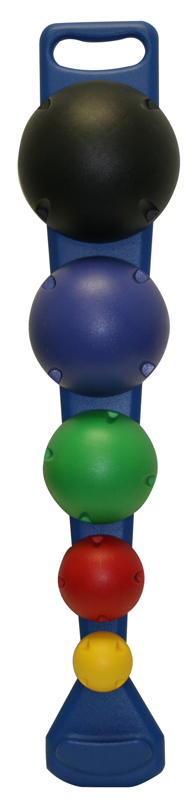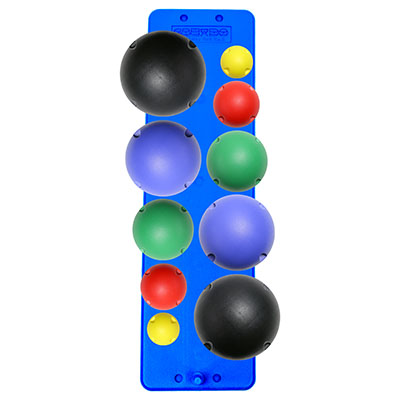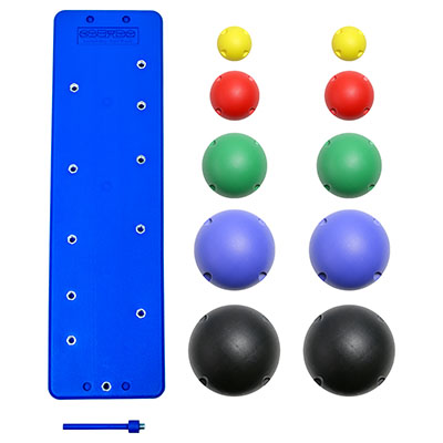 MVP balance system is a modular balance system with 4 different non-skid platforms available and 5 different color-coded instability balls to choose from. The platform stability can be altered creating various difficulty levels. The MVP balance system is perfect for balance, coordination, ankle and knee strengthening and rehabilitation, ankle range-of-motion and flexibility, core stability, improved posture, and proprioceptive training. Each board can be used either as a wobble board, if 1 ball is inserted into the center position, or rocker board, if 2 balls are inserted into opposing side positions. One ball can also be positioned off center to aid in ROM and stretching activities. The smaller instability balls offer the least instability and the larger instability balls offer the greatest instability. Larger platforms can limit the instability. Individual components available independently or available in kits with or without wall hang storage racks. Color-coded Instability balls also for use with CanDo Multi-Axial Positioning System. Included is a 5-Ball Set (1 each: yellow, red, green, blue, and black). Wall rack not included.