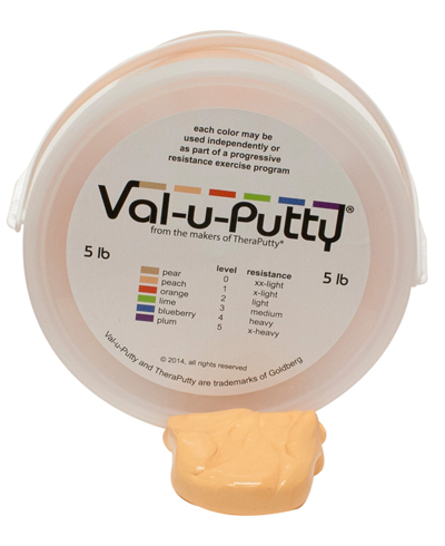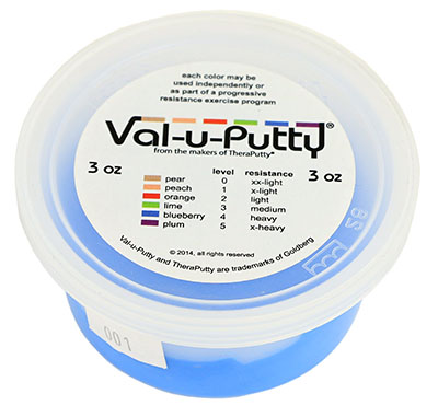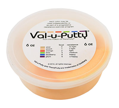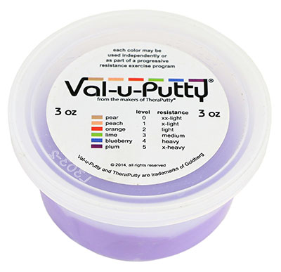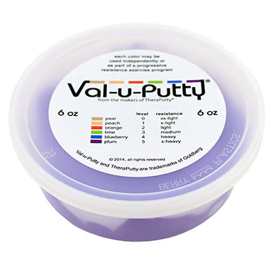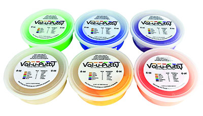 Val-u-Putty has the same great feel as the traditional CanDo Theraputty hand exercise material. Available in 6 resistance levels. Val-u-Putty is available in Berry Colors. Each color-coded putty has a different consistency ranging from xx-soft for strengthening the weakest grasp to x-firm for developing a stronger grip. The putty material is gluten, casein and latex free.