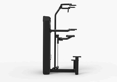 The Pull Up and Dip Assist machine uses a weight stack to reduce the user's own body weight for pull up and dip exercises. The user platform positions users in a kneeling position for a greater sense of security. Dip handles rotate to fit different shoulder widths. An integrated, digital rep counter ensures users know how fast or slow they are moving, which is key to improving muscular endurance and strength.