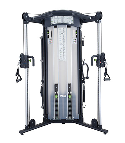 The SportsArt DS972 Dual Stack Functional Trainer offers a unique adjustable pulley ratio (1:2 and 1:4) giving users more workout options and increases weight selection options. Dual weight stack; Adjustable 1:2 and 1:4 pulley ratios; 41 pulley positions offers more workout positions and versatility; Integrated pull-up bars; Magnetized weight selector fork with retracting cord; 7-piece accessory set included; Deep-groove, 5-inch (12.7 cm) shrouded pulleys provide faultless cable tracking; Internally lubricated 2200 lbs (1000 kg) steel aircraft cables provide quiet, smooth operation.