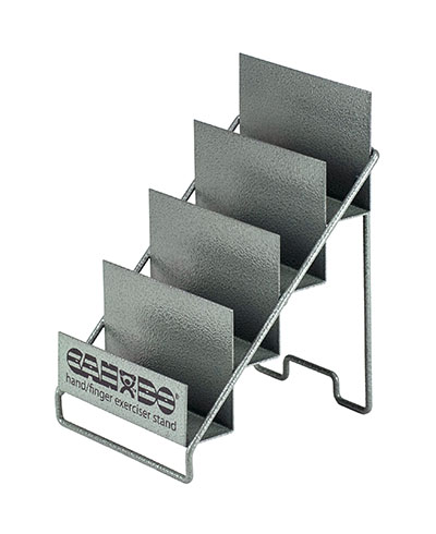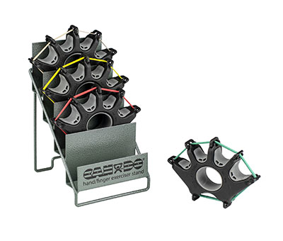The key to better finger health sits in the palm of your hand. Designed to develop isolated finger strength, flexibility and coordination, the Digi-Extend is a unique therapy device that isolates the extension of all five fingers and each of the individual finger joints. Not only for fingers, the Digi-Extend also builds hand and forearm strength to aid in the rehabilitation of carpal tunnel, arthritis, stroke, fractures, tendon injuries, nerve lacerations and tennis elbow. Compared to the weaker devices currently available for extensor strengthening and conditioning, the Digi-Extend is a professional step-up which is why this is the unit seen and used during Physical Therapy. Compact in design and effective in its simplicity, the Digi-Extend is high-tech, easy and comfortable to use in helping patients reach their therapy goals. Getting started is easy. Color-coded resistance bands are stretched around the circumference of the Digi-Extend under the hooks. The four color-coded resistance levels allow each muscle or joint to work at a comfortable level and build as increased strength is achieved. The resistive bands develop strength in each finger individually or the entire hand. So intuitive, the device lets patients easily change the resistance levels and vary their hand positions for specific exercises, helping to maximize exercise goals and prevent injury. All the exercises can be modified to help control the amount of tension by twisting the band around the hooks or using multiple bands at once. The included 4-position metal stand is a secure and convenient unit to store and display the Digi-Extends. The Digi-Extend can also be used for finger adduction, abduction, blocking and flexion exercises. The package includes 4 Digi-Extend units, 56 bands covering four levels of resistance (20 Tan Bands, 16 Yellow Bands, 12 Red Bands and 8 Green Bands), the Metal Stand and an instruction and exercise guide. The bands are Latex-free, so the Digi-Extend is safe for everyone. Position Digi-Extend with the hook openings facing away from your hand during use. This helps prevent the bands from slipping out. Using the other hand to help stabilize the device as needed during the exercises is encouraged. For some exercises, rest the Digi-Extend on a tabletop or your lap to perform exercises effectively and comfortably. The included exercise manual offers instructions in English, French, German, Italian, Spanish and Dutch.