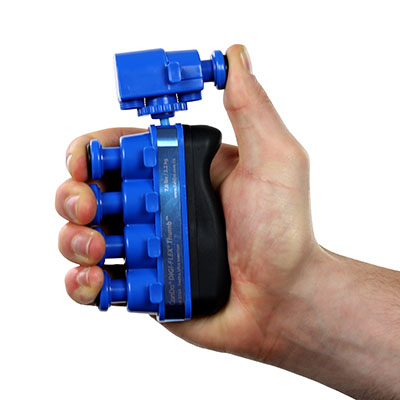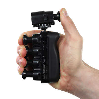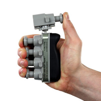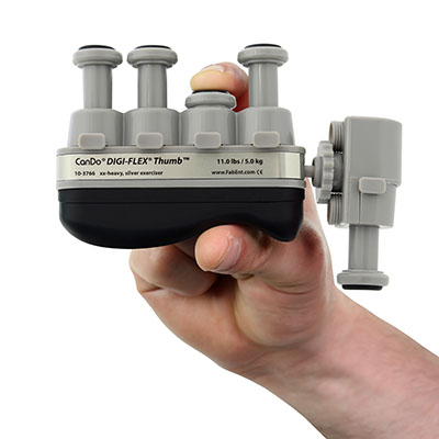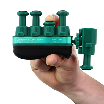 The CanDo Digi-Flex Thumb develops isolated finger and thumb strength, flexibility and coordination as it builds hand and forearm strength. The design allows for both left and right thumb usage. The adjustable thumb button can attach in 3 positions and rotates and reticulates. Each finger and thumb button can individually lock. Single spring design, with springs hidden inside plastic sheath. Use each button independently to exercise fingers or compress the entire unit for complete hand and forearm strengthening. Progressive?color-coded resistance gives patient positive feedback.