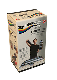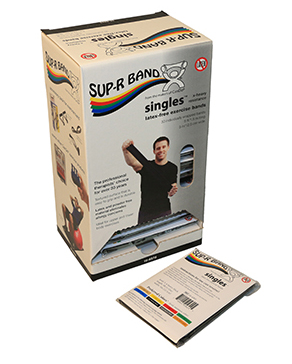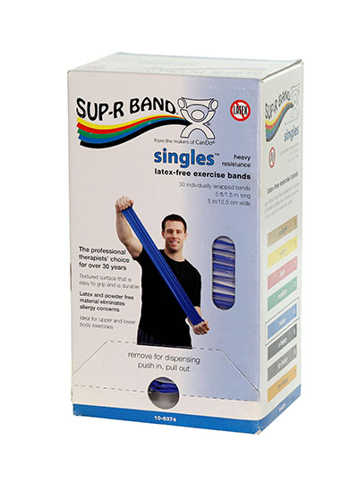 Sup-R Band® is made from a premium latex free formula and excels compared to other exercise band: our TPE latex free formula has similar use and strength characteristics to latex exercise bands; similar puncture resistance; similar tear and burst strength; requires similar force to stretch and contract; 5" width; has core for use with dispenser systems; made of Thermoplastic Elastomer (TPE); color-coded in Thera-Band® colors. Retail dispenser box contains 30 5-foot individual packaged pieces.