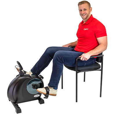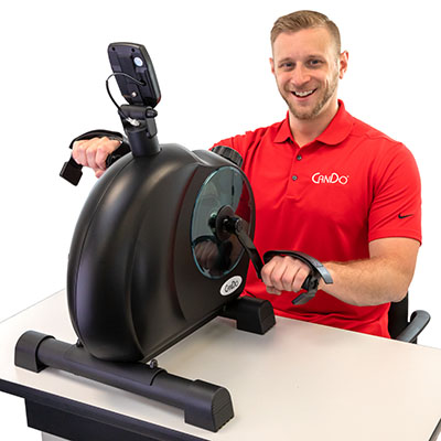 The CanDo Bi-Directional Upper Body Ergometer (UBE) paves the way in how you can do upper and lower body exercises all in one device. Its innovative design allows it to be used on a tabletop for upper body exercises or on the floor for lower body exercises. The standard model features a pair of handles with adjustable straps that are large enough to accommodate your feet and remains comfortable enough for your hands. It is ideal for increasing muscle strength, developing coordination, enhancing blood circulation as well as improving range-of-motion and cardio. The handles are bi-directional, meaning they can go in either a forward or backward motion. Doubling the exercises you can do compared to a one-directional peddler. The tension control dial lets you change pedal resistance for progressive exercises. But the real beauty of the CanDo Bi-Directional UBE is its easy to read, large tilting screen. It can display the cool down or start up time (min. / sec.), how fast you are cranking out the pedals (MPH/KPH), and the approximate distance you have achieved using the UBE. It can even display the approximate calories you have burned during each exercise session. And if you don't have time to go into a specific mode, there is also a QUICK START mode to get you going in an instant. Couple all these wonderful features with its high quality and sturdy frame, and you have the perfect choice for either a clinic or home setting. The CanDo Bi-Directional UBE is an easy to assemble device that includes 2 'AAA' batteries. The adjustable base with non-skid, molded feet adds extra stability for the best experience you can have with an UBE.