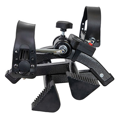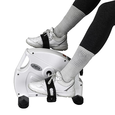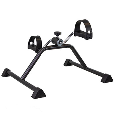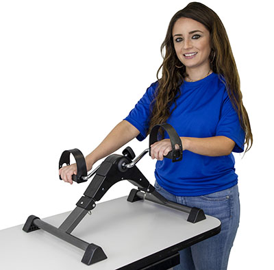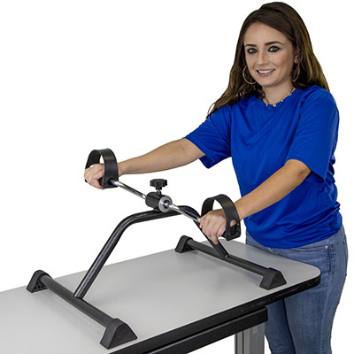 The CanDo pedal exerciser ships pre-assembled - just add tension knob! Pedal exercisers are inexpensive and portable exercisers for both the upper and lower body. They can be used on the floor for foot pedaling, or on the tabletop for hand pedaling. Wide leg spread and non-marring feet keep exerciser stable even when patient has little muscle control. Wrap around adjustable foot straps for use with or without shoes. Adjustable tension knob allows for easy changes in pedaling difficulty level. Pedal forwards or backwards.